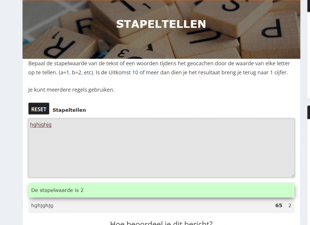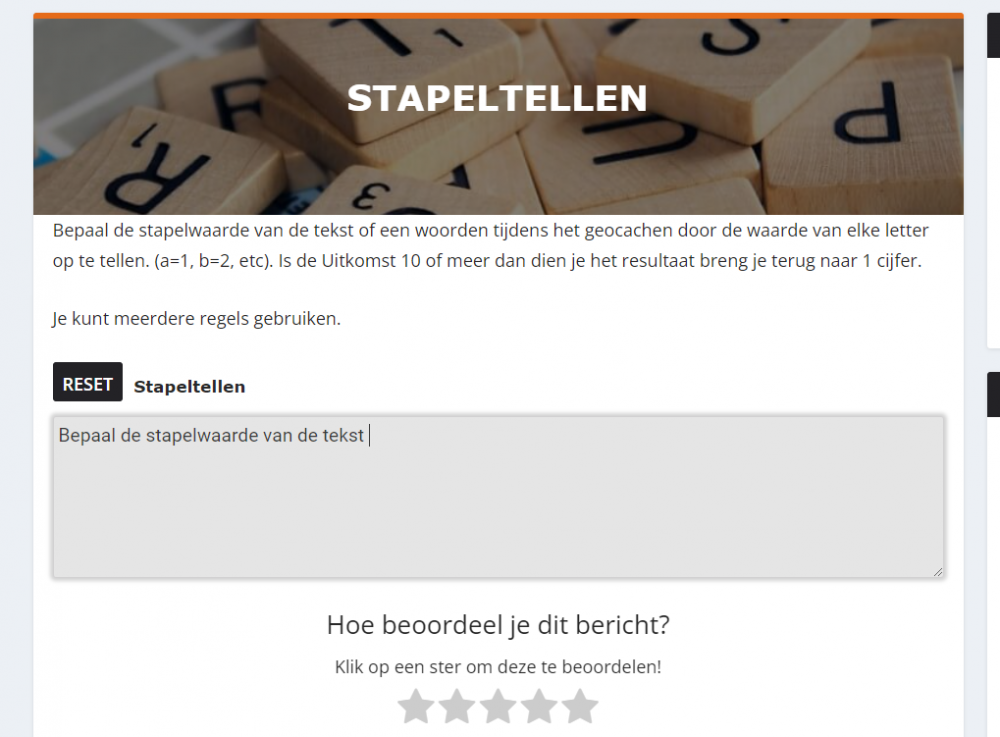 Ik gebruik de eerste twee functies het meest: Woordwaarde Stapeltellen Projecteren doe ik met de gps. Qua apps gebruik ik: Army Knife for Android Geocaching Toolbox Geocaching app Adventure Lab WhereYouGo -